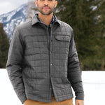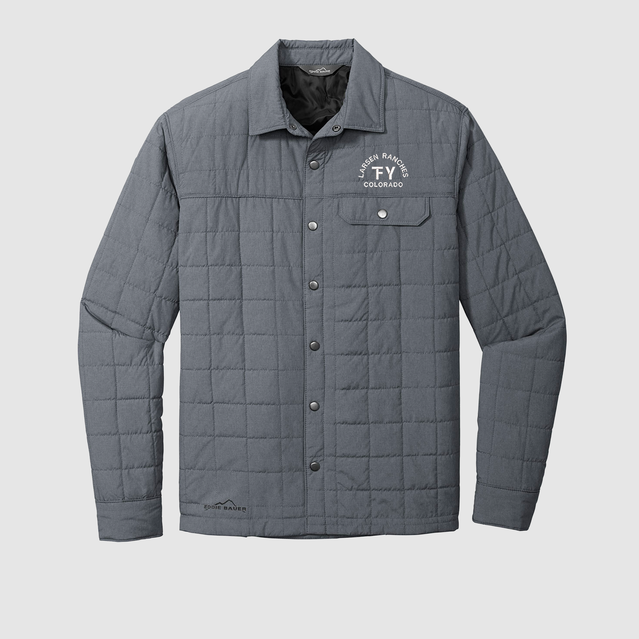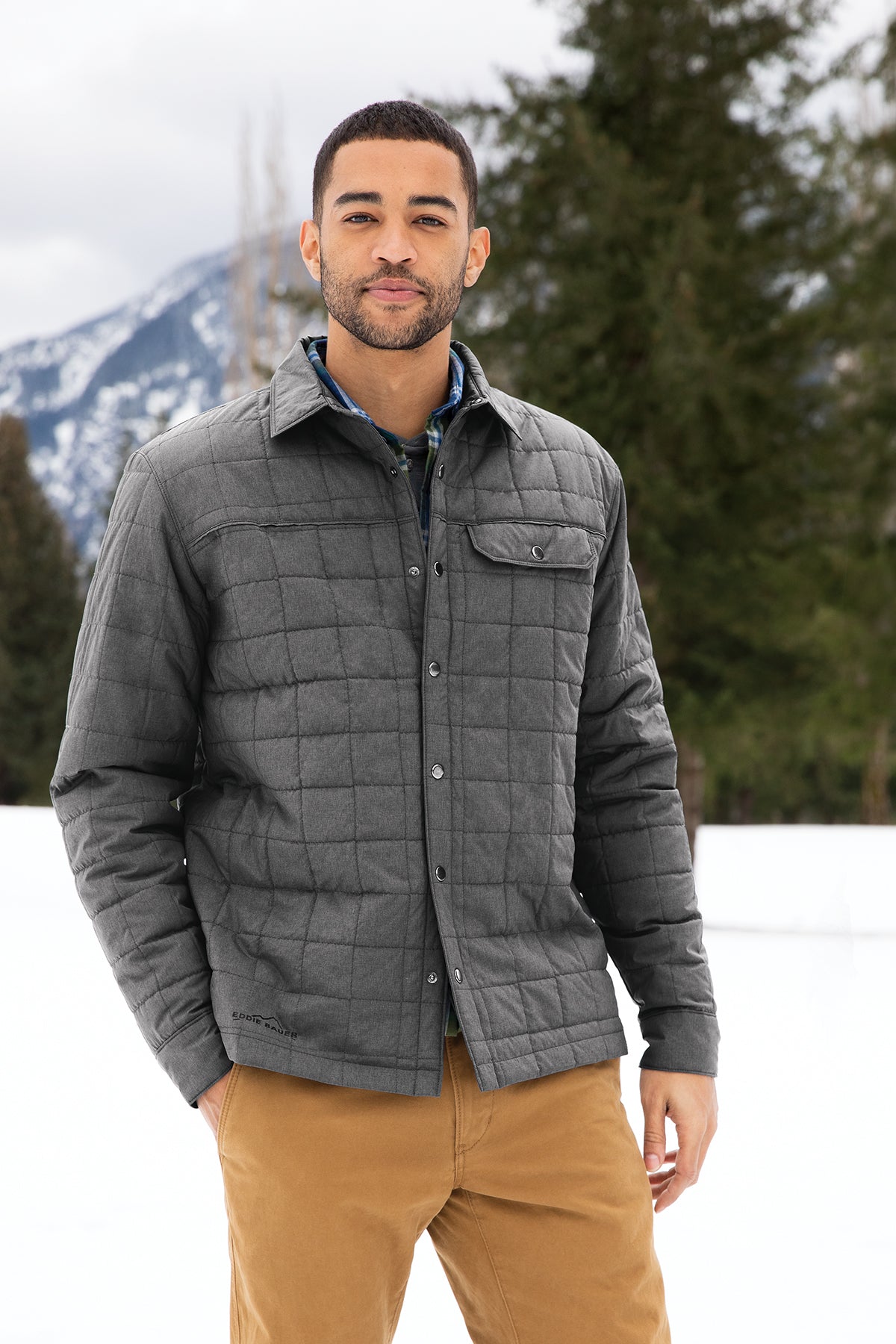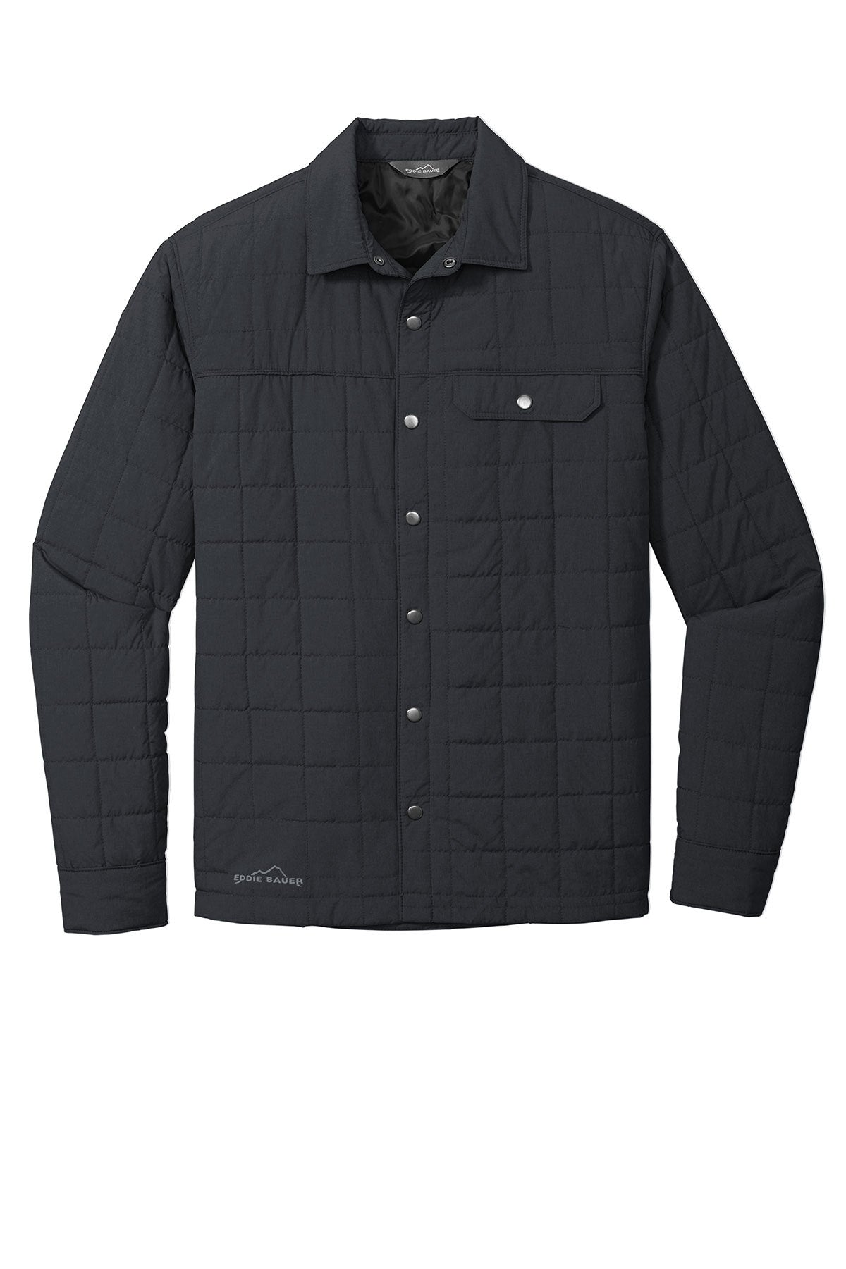 Midweight jacket warmth meets collared shirt style in this shirt jac that blurs the line between the great outdoors and indoors. Snap-front closure and snap cuffs. Drop-in left chest pocket. Contrast Eddie Bauer heat transfer logo on the right hem. Decoration access pocket. Made of 100% polyester fabric and 1.8-ounce, 100% polyester fill. Water-resistant with a PU coating.